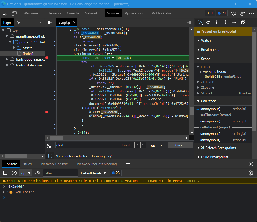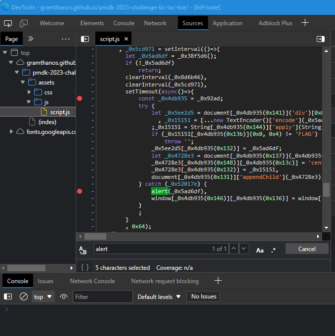 Αφού όταν το παιχνίδι τελειώνει εμφανίζετε ένα μήνυμα τύπου alert ψάχνουμε στον κώδικα το την κλήση αυτού του μηνύματος για να βρούμε την συνάρτηση που ελέγχει αν νικήσαμε ή χάσαμε το παιχνίδι. Αφού βρούμε την κλήση της alert, κάνοντας κλικ δίπλα στα αριστερά των γραμμών που θέλουμε, βάζουμε μερικά breakpoint που θα σταματήσουν την εκτέλεση του κώδικα και θα μας επιτρέψουν να δούμε τις μεταβλητές που θέλουμε για να καταλάβουμε πως δουλεύει ο κώδικα αυτός