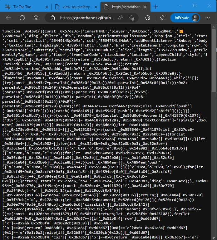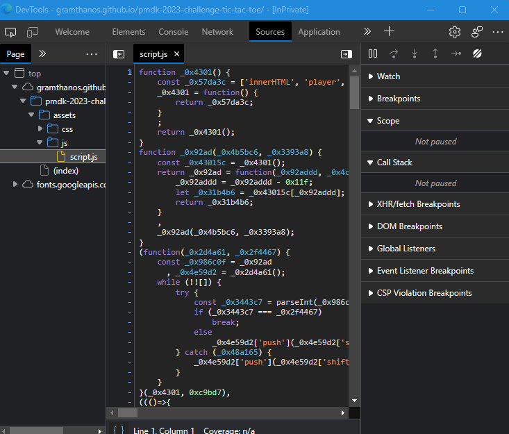 Ανοίγουμε λοιπόν τον κώδικα και μέσω των developer tools του περιηγητή της ιστοσελίδας, μέσο των οποίων μπορούμε και να αποτελματώσουμε τον κώδικα. Για να το κάνουμε αυτό, κάνουμε δεξί κλικ στην σελίδα, επιλέγουμε “inspect element”, στην συνέχεια στο πάνελ που ανοίγει πάμε στην καρτέλα “Sources” και ανοίγουμε το αρχείο “script.js” της σελίδας το οποίο περιέχει τον κώδικα του παιχνιδιού. Στο κάτω μέρος του κώδικα, τα εργαλεία προγραμματιστή μας δίνουν και ένα κουμπί για να κάνουν beautify τον κώδικα (το κουμπί με την ένδειξη “{ }”) έτσι ώστε να διαβάζετε πιο εύκολα.