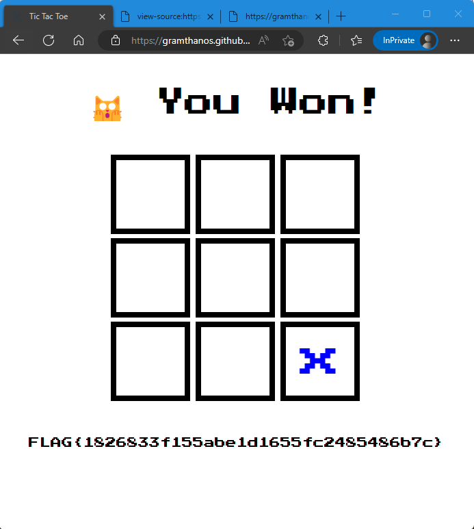 Στην εκφώνηση της δοκιμασίας μας δίνεται μια ιστοσελίδα, στην οποία τρέχει ένα παιχνίδι τρίλιζας, το οποίο πρέπει να νικήσουμε.