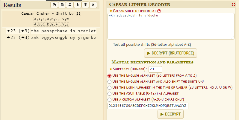 Από την περιγραφή και τον τίτλο της δοκιμασίας καταλαβαίνουμε πως το μήνυμα wkh sdvvsukdvh lv vfduohw είναι Caesar Cipher το οποίο μπορούμε να αποκρυπτογραφήσουμε με το χέρι ή με κάποιο εργαλείο σαν το Caesar Cipher Decoder. Ο αριθμός 23 που μας δίνεται φαίνεται να είναι το κλειδί της κρυπτογράφησης.